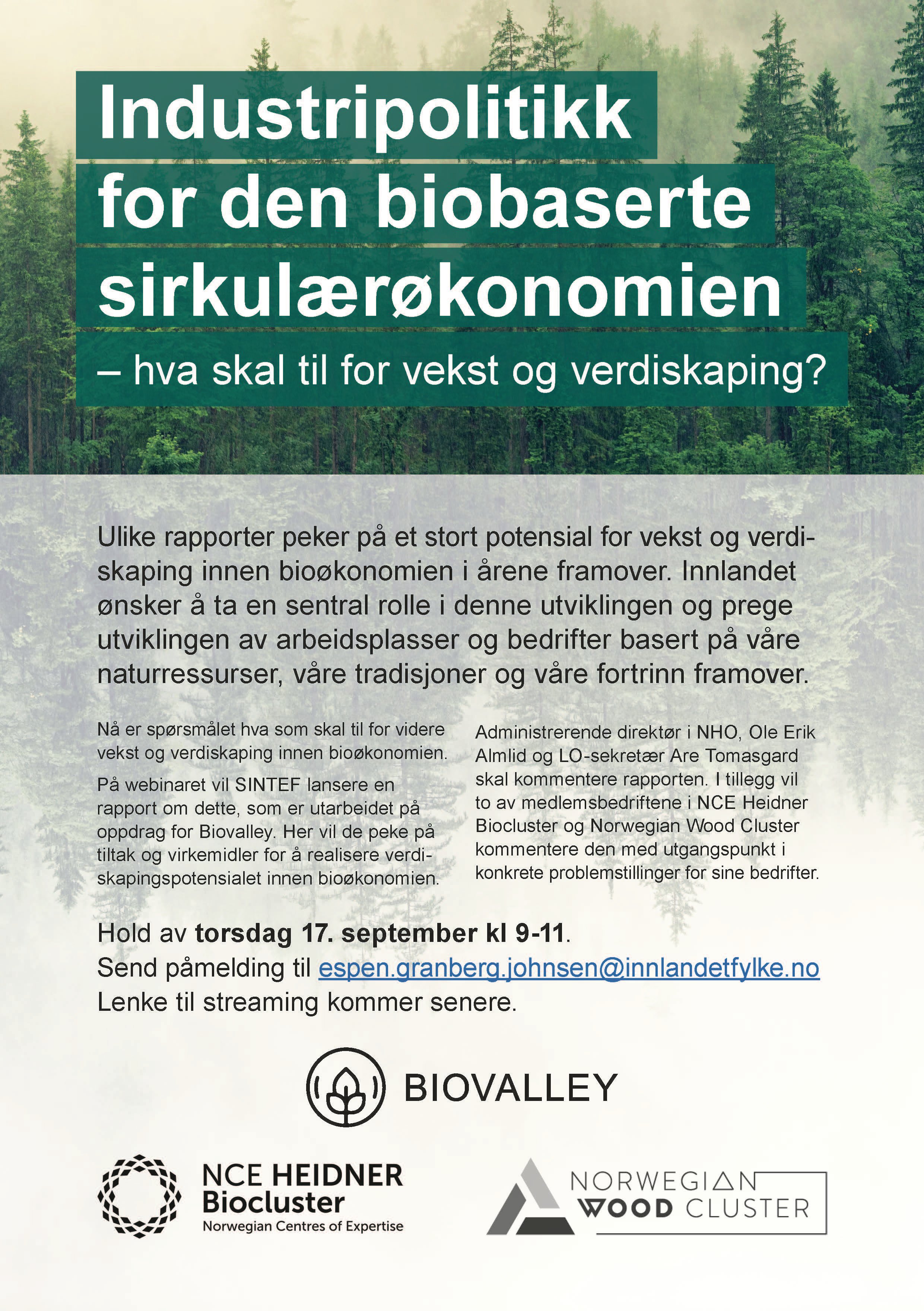 Sammen med NCE Heidner Biocluster og Norwegian Wood Cluster arrangerer Biovalley webinar, torsdag 17. september kl 9-11. Industripolitikk for den biobaserte sirkulærøkonomien - hva skal til for vekst og verdiskaping?