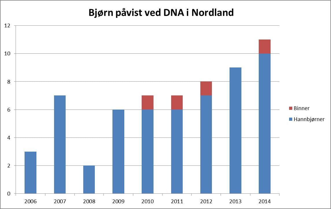 I løpet av årene 2006-2014 er det i alt påvist 33 ulike bjørner i Nordland. Noen få individer dukker opp flere år på rad, men de fleste blir påvist i ett eller to år for så å bli borte. Dette kan forklares med at det er hannbjørner fra tettere bjørnebestander i Sverige og Nord-Trøndelag som er på vandring på leting etter binner og nye leveområder. Det er kun registrert to binner i Nordland siden man begynte med DNA-analyser. Begge disse er påvist i indre deler av Saltdal i 2010-2014.