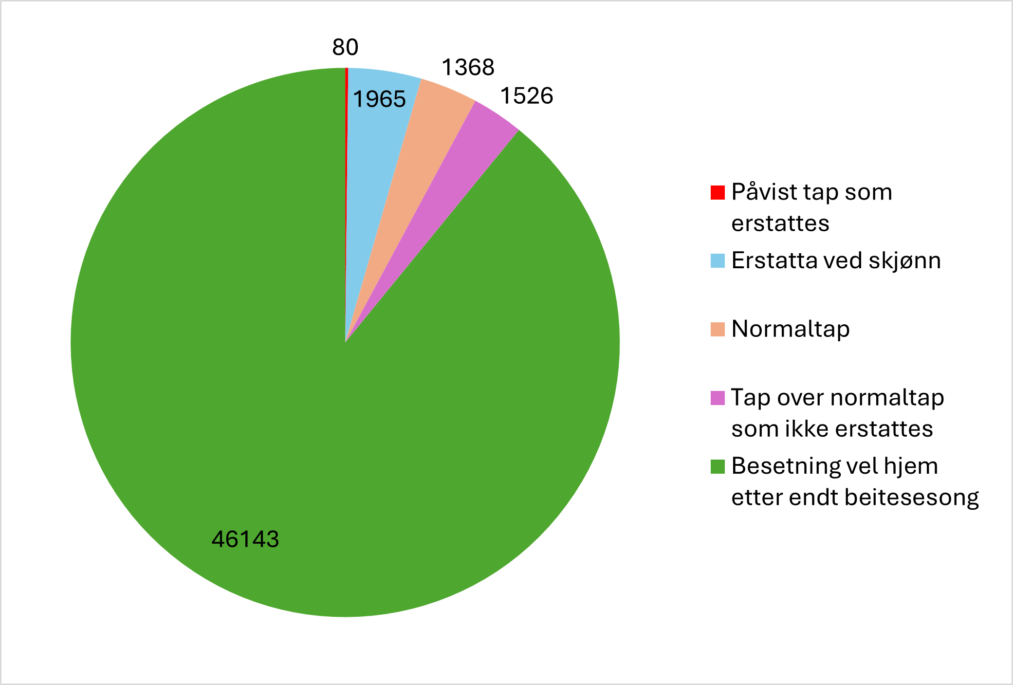 Etter beitesesongen 2025 har Statsforvalteren vurdert at det er sannsynlighetsovervekt for at rovvilt er tapsårsak for 1965 sau og lam i tillegg til de 80 dyrene som var påvist rovviltdrept. For det resterende tapet, vurderte vi at det ikke var større sannsynlighet for at tapene skyldtes fredet rovvilt enn at det skyldtes andre tapsårsaker som ulykke, sykdom og ikke erstatningsberettiget rovvilt.