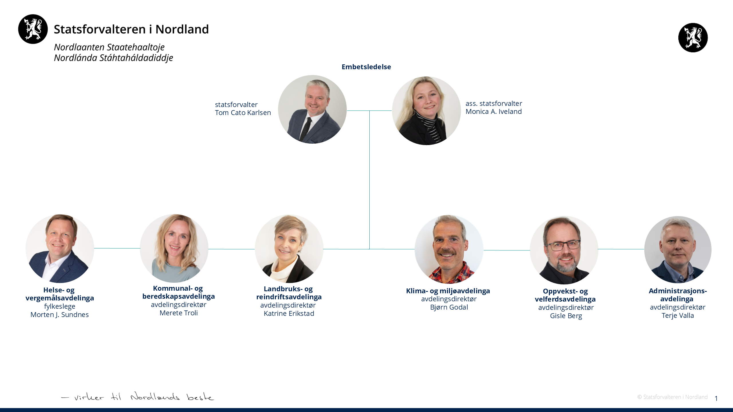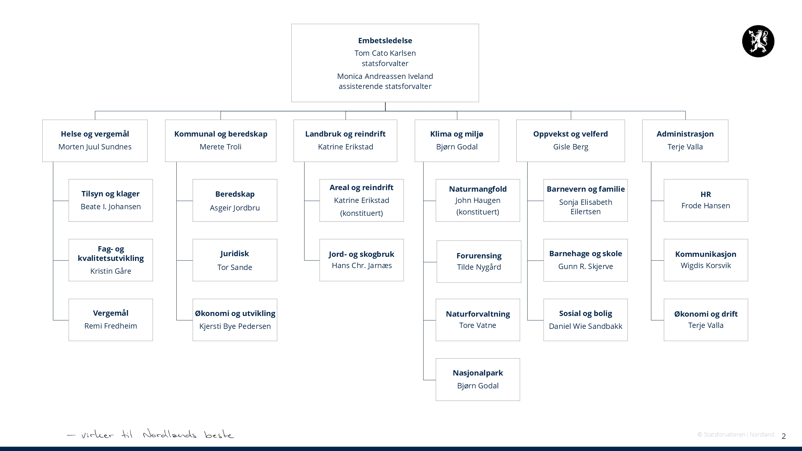 Statsforvalteren er ulikt organisert fra fylke til fylke. Statsforvalteren i Nordland har omlag 180 ansatte fordelt på embetsledelsen og seks avdelinger.