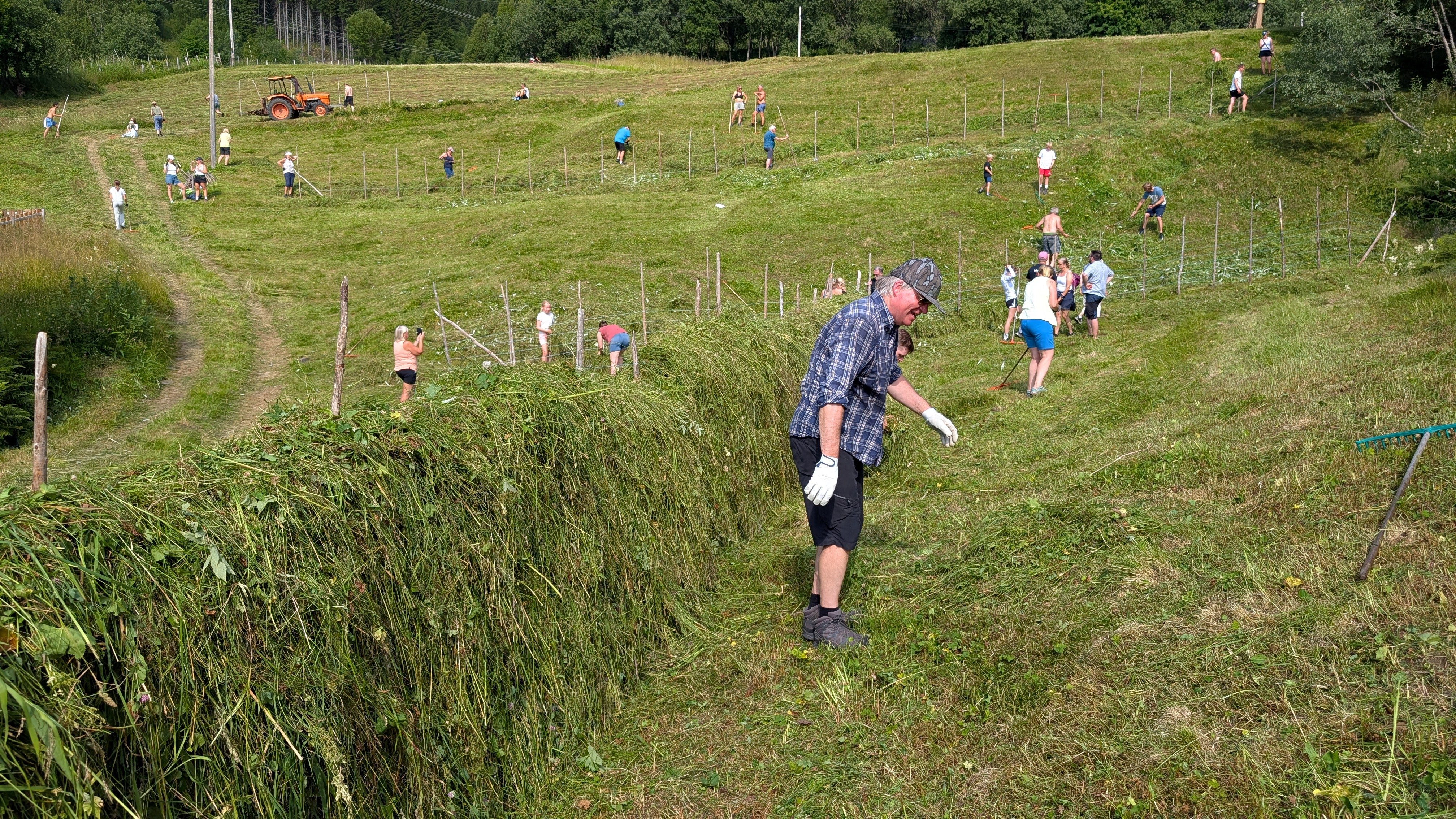 Foto: Slått ved Engan med hesjing. Foto: Anne Marit Isachsen.