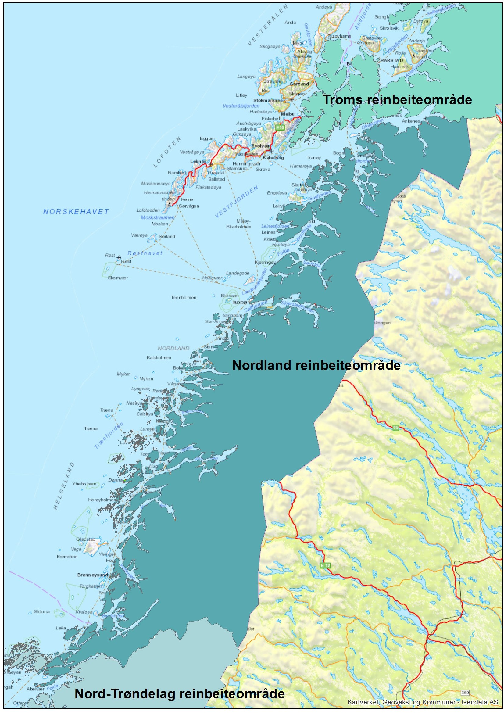 | Nordland reinbeiteområde | Gjelder Nordland nord til Rombaksfjorden i Narvik (med unntak av enkelte øyer på kysten). I sør er deler av Nord-Trøndelag inkludert (sør til Folda og Innerfolda). Planer skal sendes på høring til Statsforvalteren i Nordland og til berørt reinbeitedistrikt og sameby. |