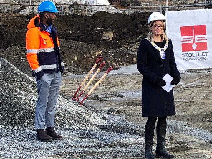 Skolekorpset spiller og ordføreren holder tale når første spadetak tas for Stokmarknes skole i massivtre