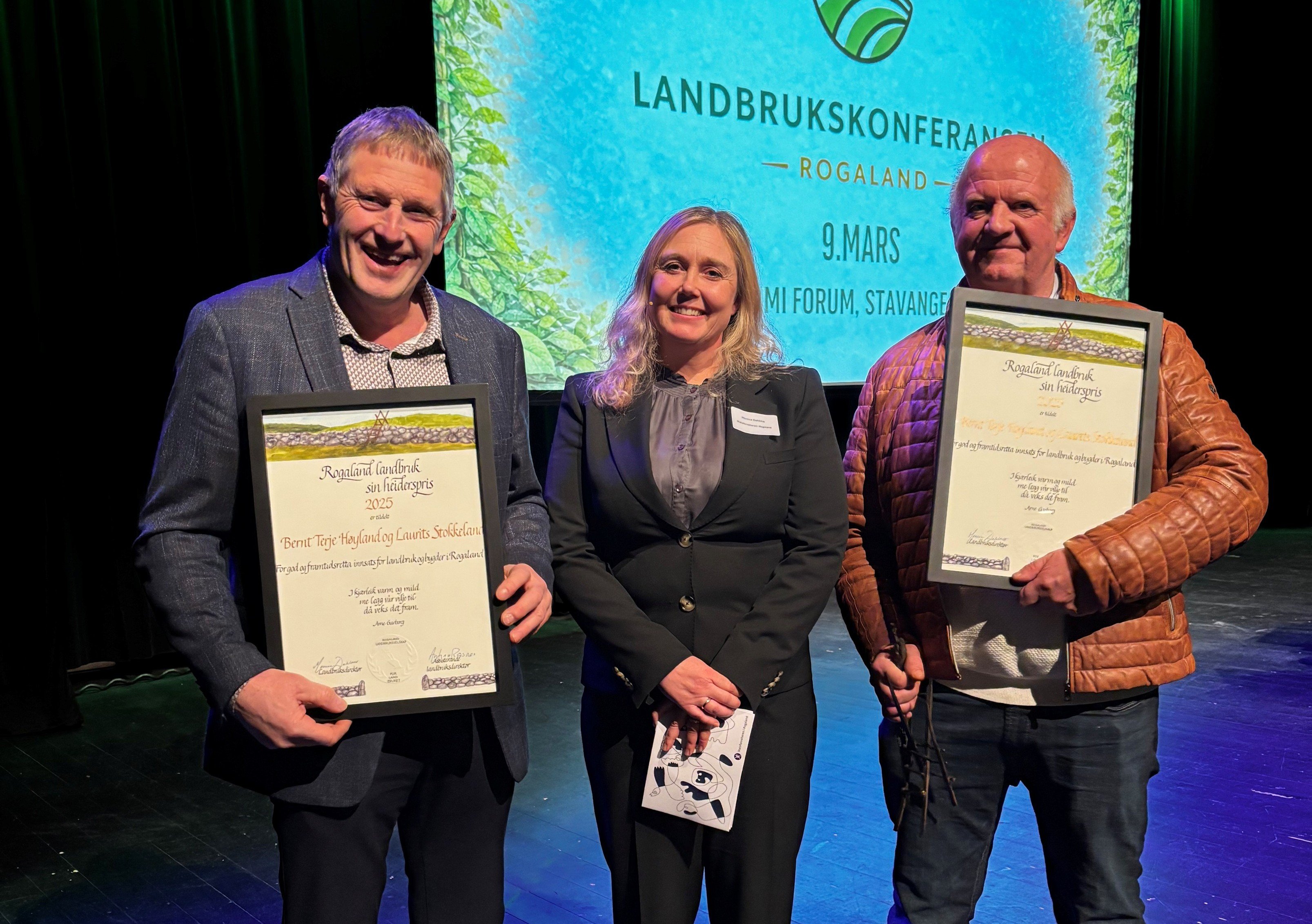 Bernt Terje Høyland og Laurits Stokkeland fekk landbruket i Rogaland sin heiderspris for 2025