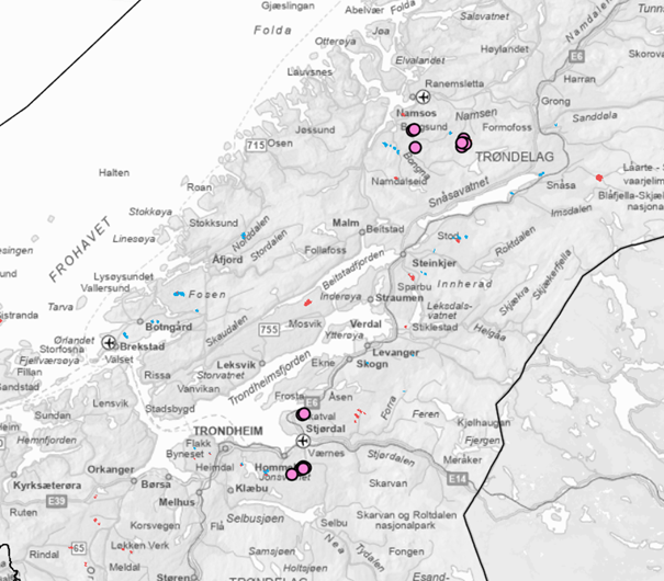 Årets myrrestaureringsprosjekter i Trøndelag (rosa punkter) ligger i Stjørdal, Namsos og Overhalla kommuner. Foto: Statsforvalteren i Trøndelag.