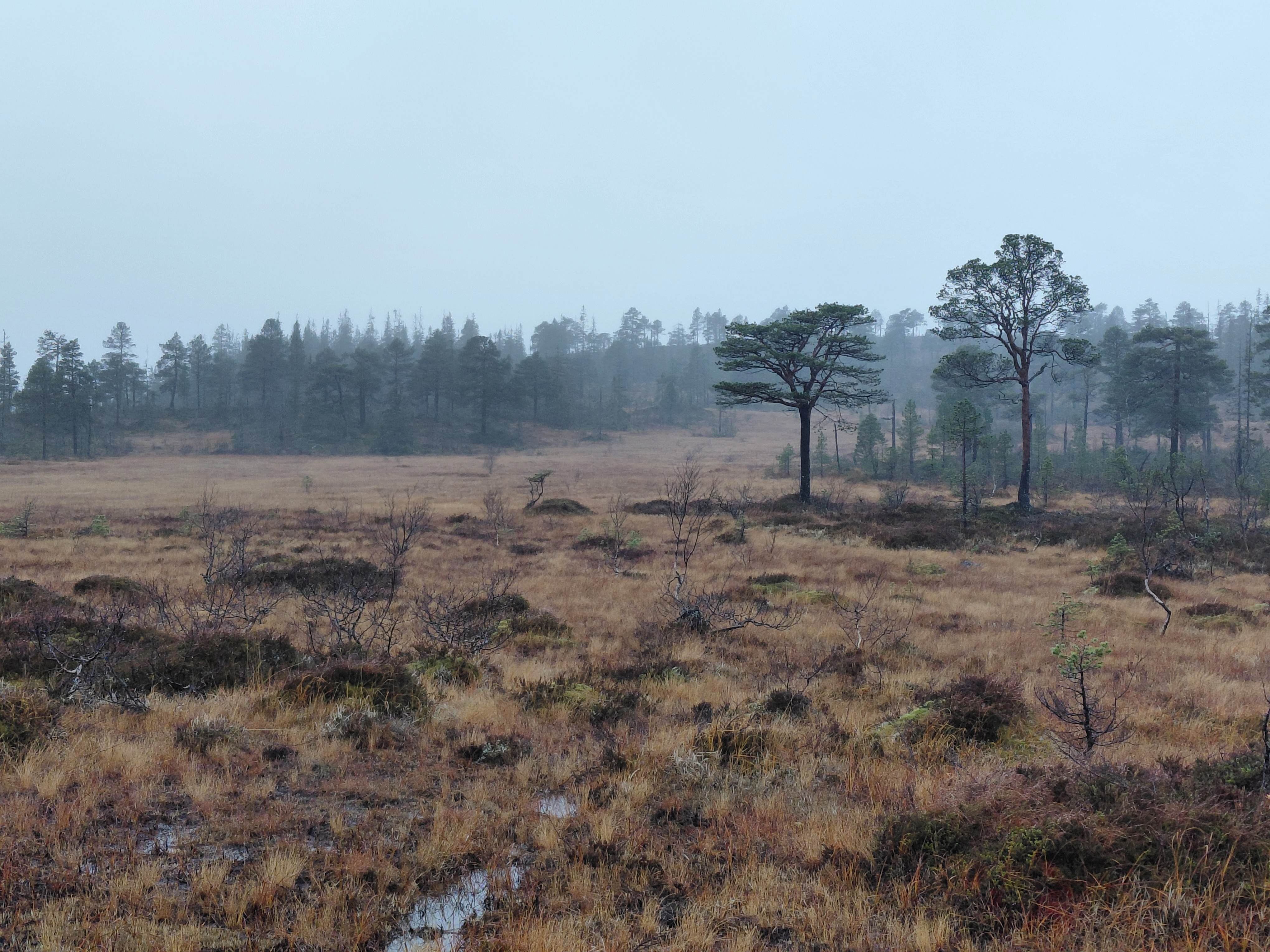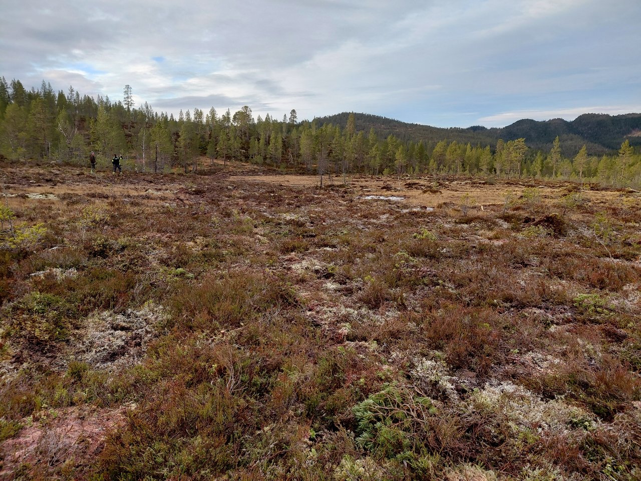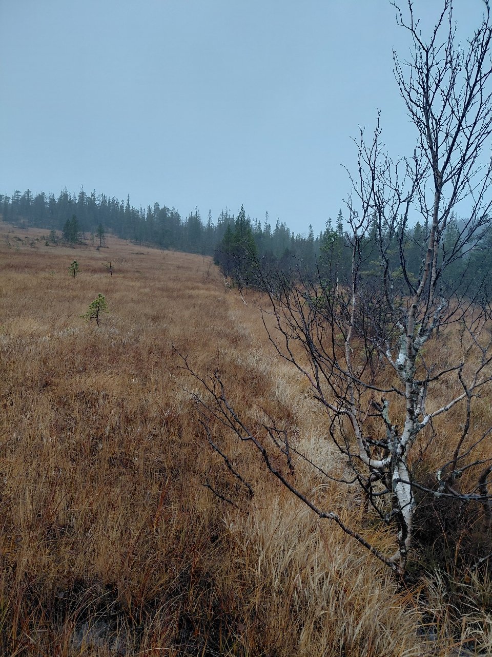 Står du her dette bildet er tatt trenger du ikke trente ører – her vil du høre de store mengdene vann som blir drenert ut av myra med høylytte klukk. For et trenet øye er det lett å se at denne myra er skåret gjennom av en lang grøft – der grøftingen som ble utført for mer enn 40 år siden ikke resulterte i noe skog av nevneverdig økonomisk verdi. Foto: Marte Synnøve Lilleeng/Statsforvalteren i Trøndelag