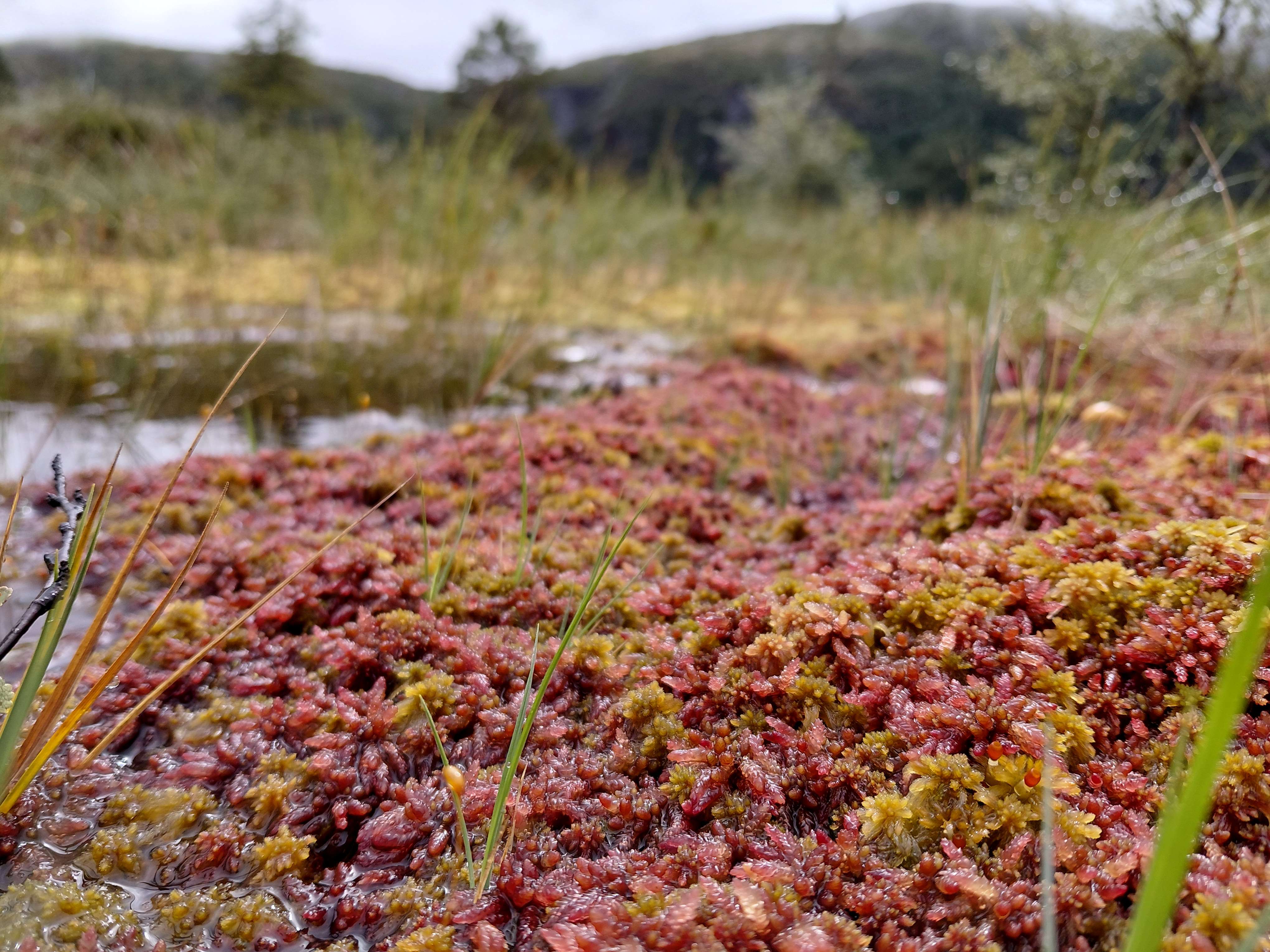 Torvmosene har en nøkkelrolle på myra. For at torvmosene skal komme tilbake må vi reparere hydrologien. Med vannet og torvmosene følger mange andre arter som er viktige i myrøkosystemet og i den store sammenhengen. Insekter, amfibier og fugler. Foto: Marte Synnøve Lilleeng/Statsforvalteren i Trøndelag.   For myrrestaurering benyttes ofte 8 – 15 tonns gravemaskiner. De må ha et veldig lavt marktrykk – både for at det skal være trygt, og for at det skal bli minst mulig kjørespor. Dette kan ordnes med brede belter og eller kjørematter. Foto: Marte Synnøve Lilleeng/Statsforvalteren i Trøndelag.