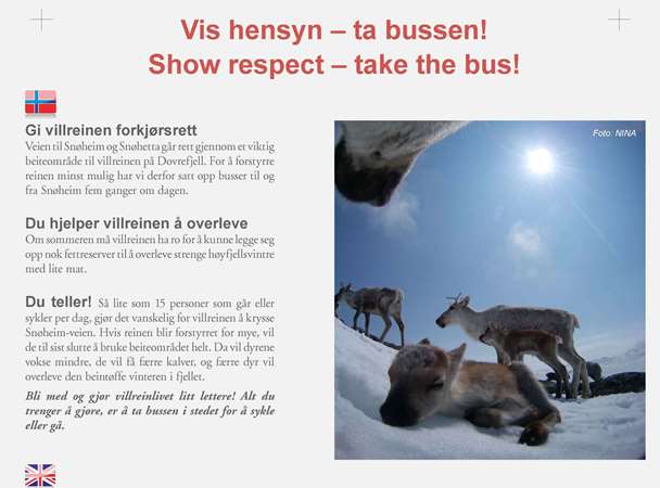 Det er tillatt å ferdes til fots og med (vanlig) sykkel i skytefeltet, med unntak av ferdselsrestriksjoner under eksplosivrydding. Av hensyn til villreinen i området oppfordrer vi likevel folk til å ta bussen inn til Snøheim, framfor å gå/sykle: