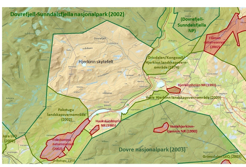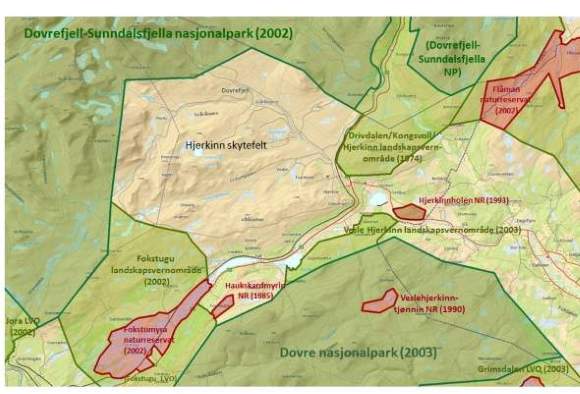 Illustrasjonen nedenfor viser Hjerkinn skytefelt med omkringliggende verneområder før et eventuelt vern av området. Fylkesmannen utarbeidet et kart som definerer det området som skal utredes for et mulig framtidig vern (utredningsområdet) ved oppstart av verneplanarbeidet i 2013. Du finner både dette og andre kart i høyre menykollonne her.