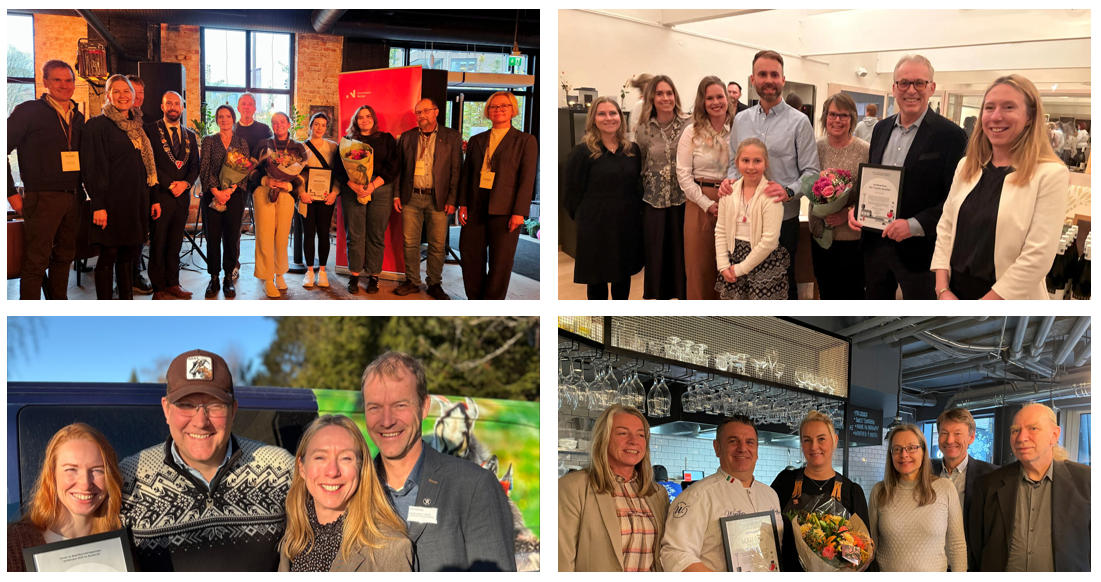 Fire fylkesvise vinnere av bedriftsutviklingsprisen 2025: Øverst til venstre: Rygge Meieri, vinner fra Østfold. Øverst til høyre: Jordbærbua, vinner fra Akershus. Nederst til venstre: Øvrejorde gård, vinner i Buskerud. Nederst til høyre: Winther Ysteri, vinner i Oslo (Foto: Innovasjon Norge og Hanen)