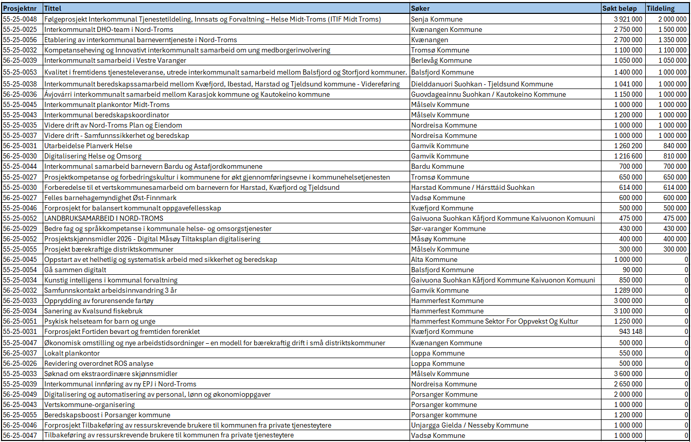 Vi mottok 41 søknader fra kommunene, og har fordelt 20,319 millioner til 23 prosjekter. Det vil bli sendt brev om fordelingen til den enkelte kommune  etterhvert. Midlene vil bli utbetalt over rammetilskuddet i januar.