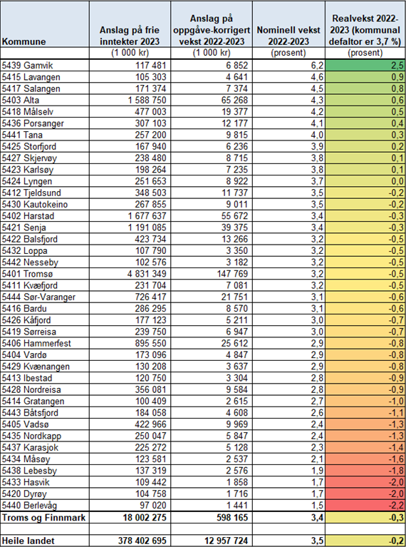Tabellen under viser anslag på frie inntekter i 2023 for kommunene i Troms og Finnmark, anslått nominell vekst og realvekst, målt fra anslag på oppgavekorrigert regnskap 2022. Realveksten tar hensyn til anslått lønns- og prisvekst i 2023 på 3,7 % (kommunal deflator).