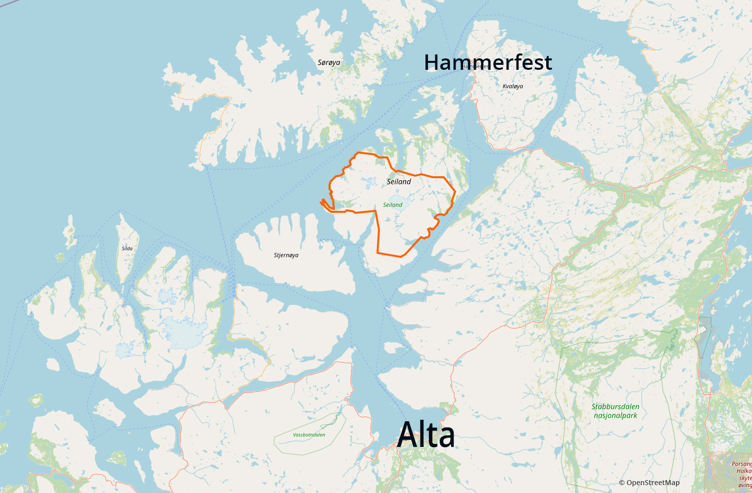 - Ligger på øya med samme navn i Alta og Hammerfest kommuner.