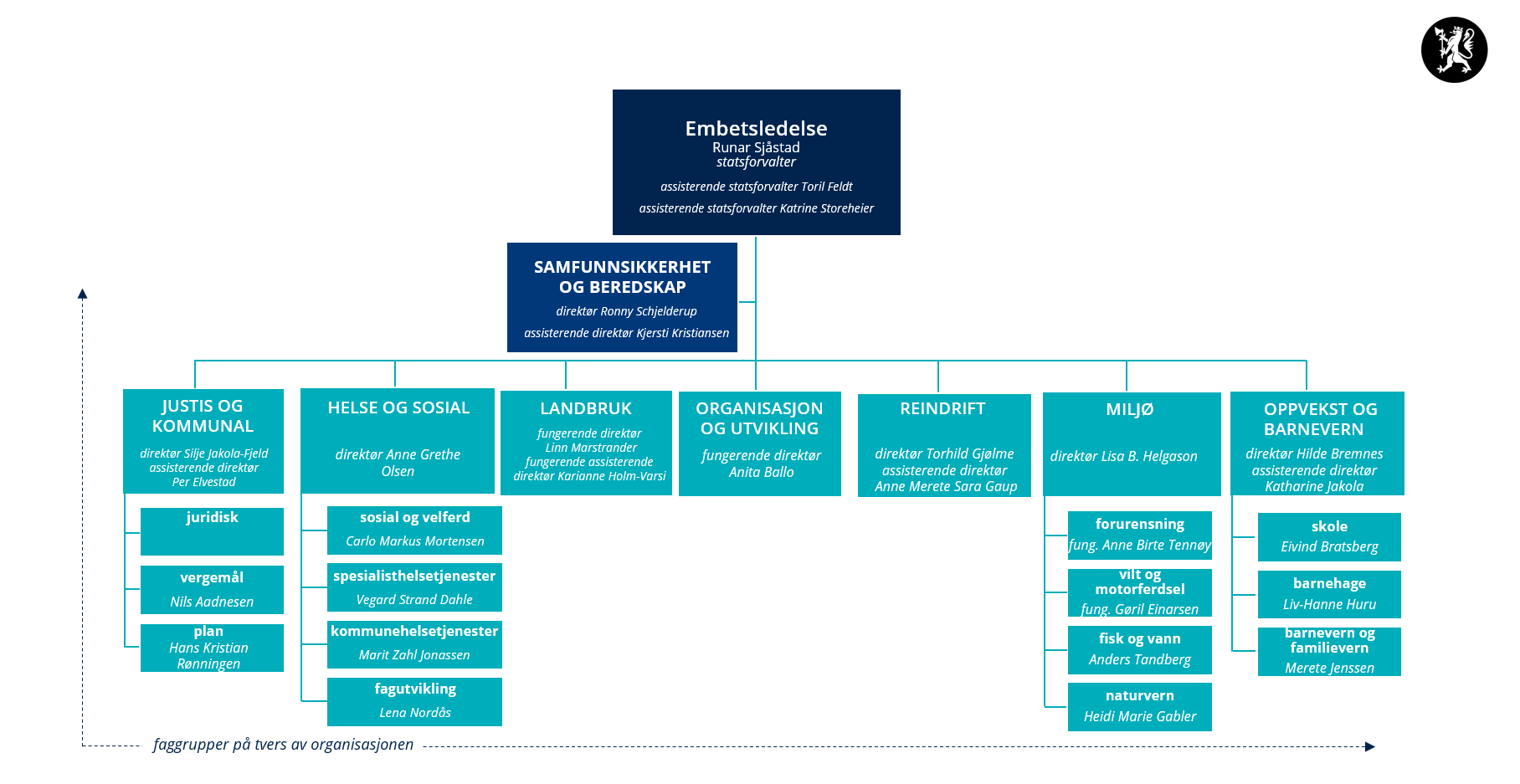Embetsledelsen består av statsforvalter Runar Sjåstad, assisterende statsforvalter Toril Feldt (Vadsø) og assisterende statsforvalter Katrine Storeheier (Tromsø).