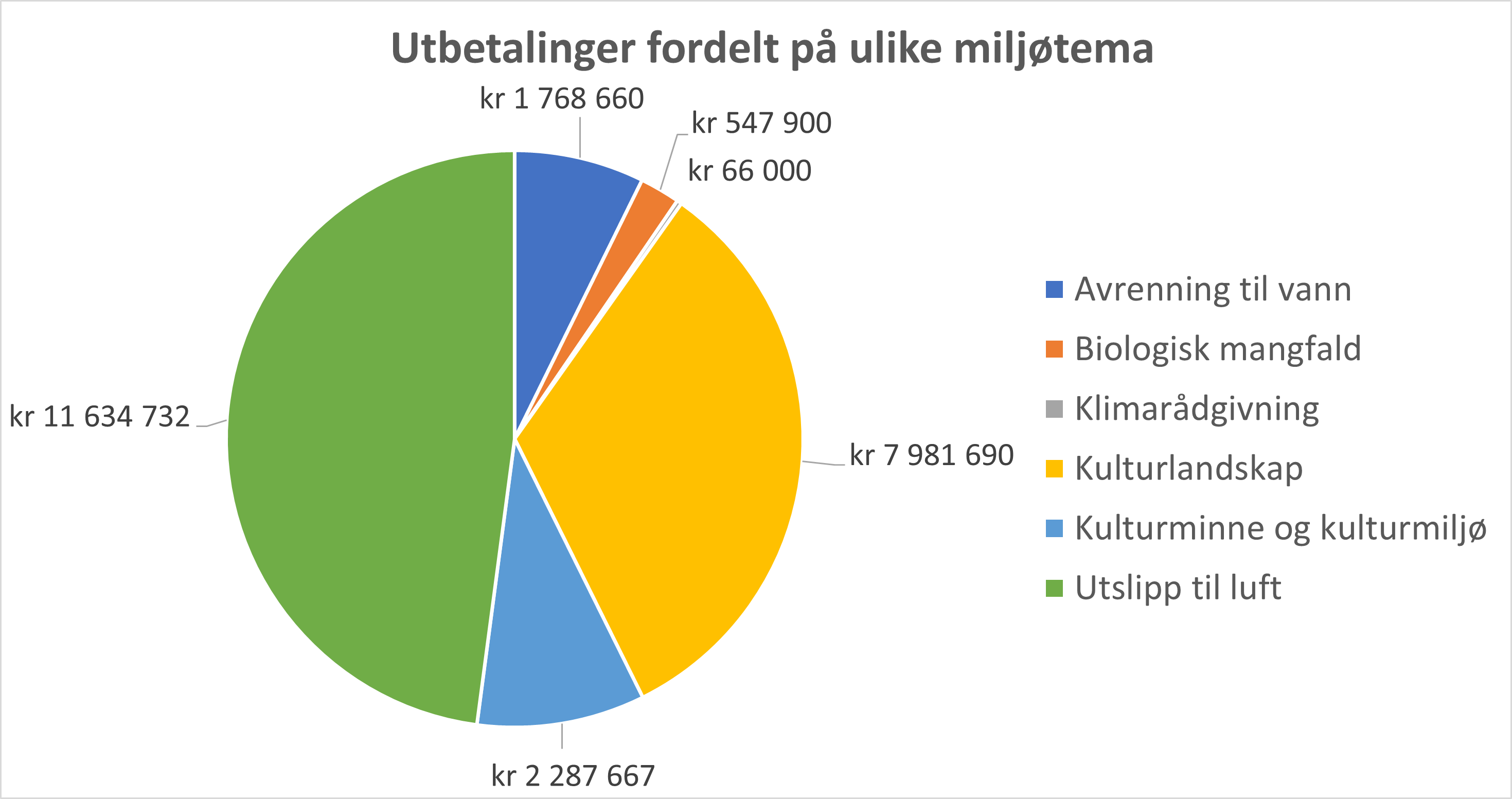 Innanfor gjeldande program (2019-2022) kan bønder søkje om tilskot til tiltak innanfor seks miljøtema. Nedanfor kan du sjå korleis utbetalingane for 2021 fordeler seg på desse tema.