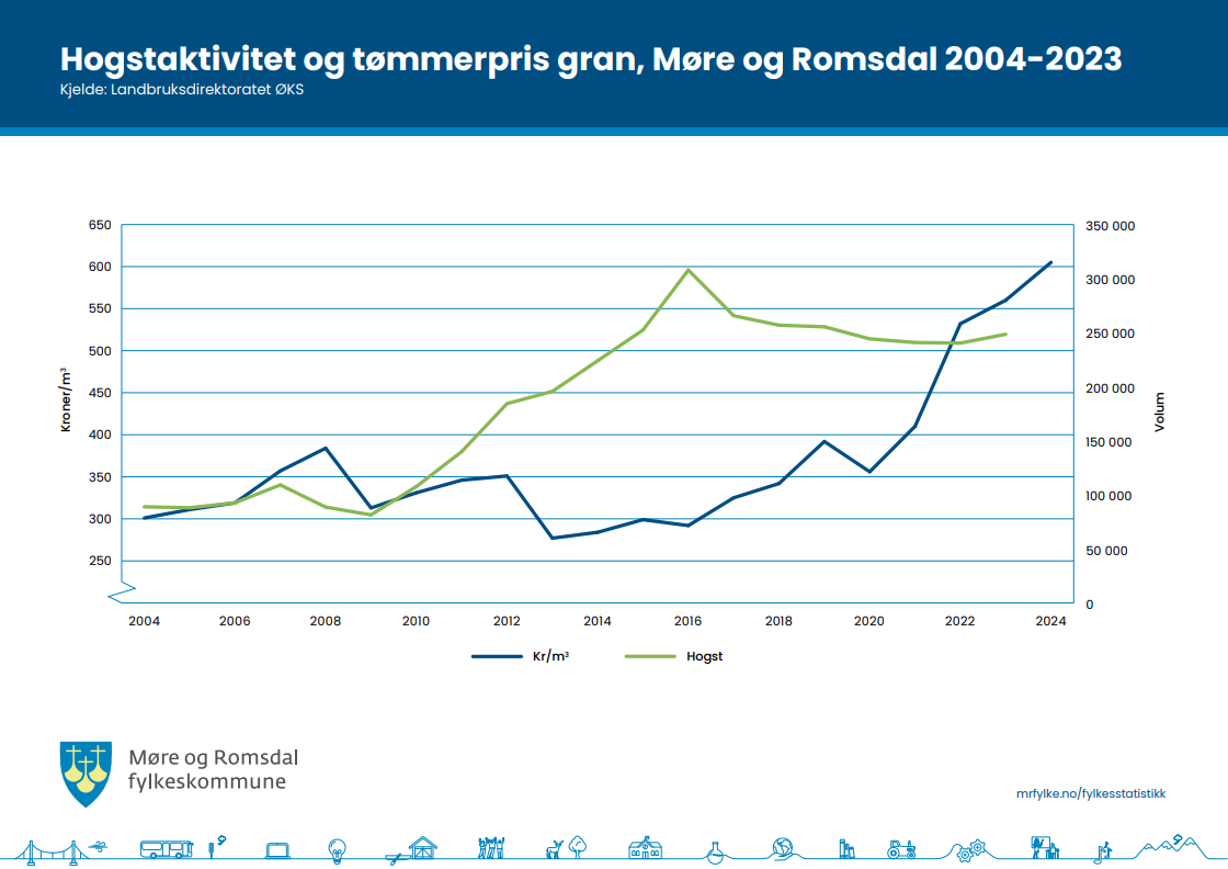 I 2020 var det ein snittpris på grantømmer i Møre og Romsdal på 356 kr/m3. Per juli 2024 var snittprisen 605 kr/m3. Det er forventa ytterlegare prisauke på sagtømmer og slip, som kan føre til ein snittpris på godt over 600 kr/m3 på gran for året 2024.