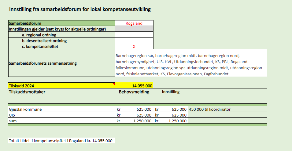14. mars og 3. mai 2024 behandlet samarbeidsforum innmeldte behovsmeldinger fra partnerskap i Rogaland. Etter drøfting og vurdering leverte forumet en omforent innstilling til fordeling av midler til Statsforvalteren. Statsforvalteren har i tråd med innstillingen nå tildelt midlene til eiere og universitet og høgskoler.