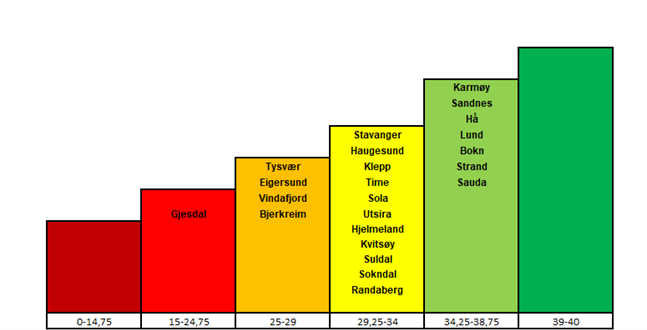 I år er det ingen kommunar som ligg i mørkegrøn sone. Sju kommunar ligg i lysegrøn sone, fire i oransje sone og éin kommune i raud sone. Til samanlikning var det i 2024 tre kommunar i mørkegrøn sone og éin i mørkeraud sone.