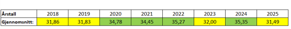 Fram til 2024 har kommunane hatt ei stor framgang i arbeidet med samfunnstryggleik og beredskaps, med rekordhøg poengsum i fjor. I år ser vi en endring. Gjennomsnittet i 2025 er 31,49 poeng – ein nedgang på 3,86 poeng frå 2024. Dette er den lågaste poengsummen sidan oppstarten i 2019. Dette betyr ikkje nødvendigvis svekka beredskap, men at krava til kommunane har blitt skjerpa.