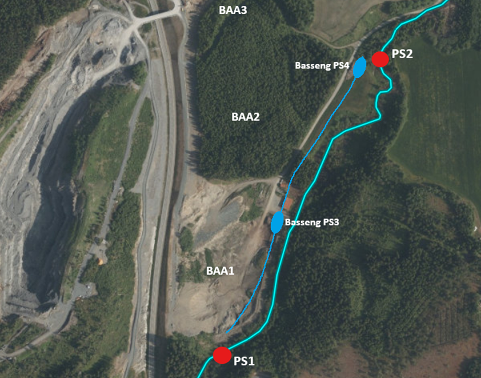Figur 1 Oversikt over planområdet med tilhørende prøvetakingsstasjoner PS1 og PS2 i Tullbekken, samt PS3 og PS4 fra sedimentasjonsbassengene.