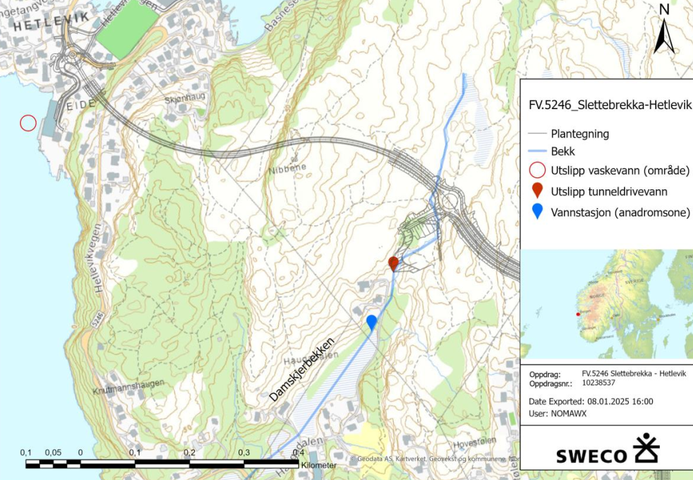 Vestland fylkeskommune skal byggje 2 450 meter ny veg frå Slettebrekka til Hetlevik på Askøy, inkludert 600 meter tunnel. Det blir søkt om mellombels utsleppsløyve for utslepp av tunnelvatn under anleggsfasen i Damskjerbekken frå driving av tunnel mellom Haugadalen og Hetlevik. Det blir òg søkt om utslepp av reinsa tunnelvaskevatn i driftsfasen, som skal førast ut i sjøen ved Eide, Hauglandsosen.