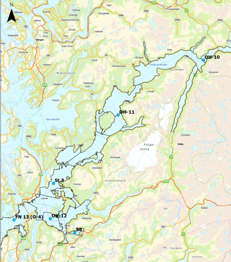 Figur 1: Kart som visar stasjonane kor konsulent prøvetok næringssalt, temperatur, siktedjup, klorofyll og oksygen i Hardangerfjordens andre år med overvaking.