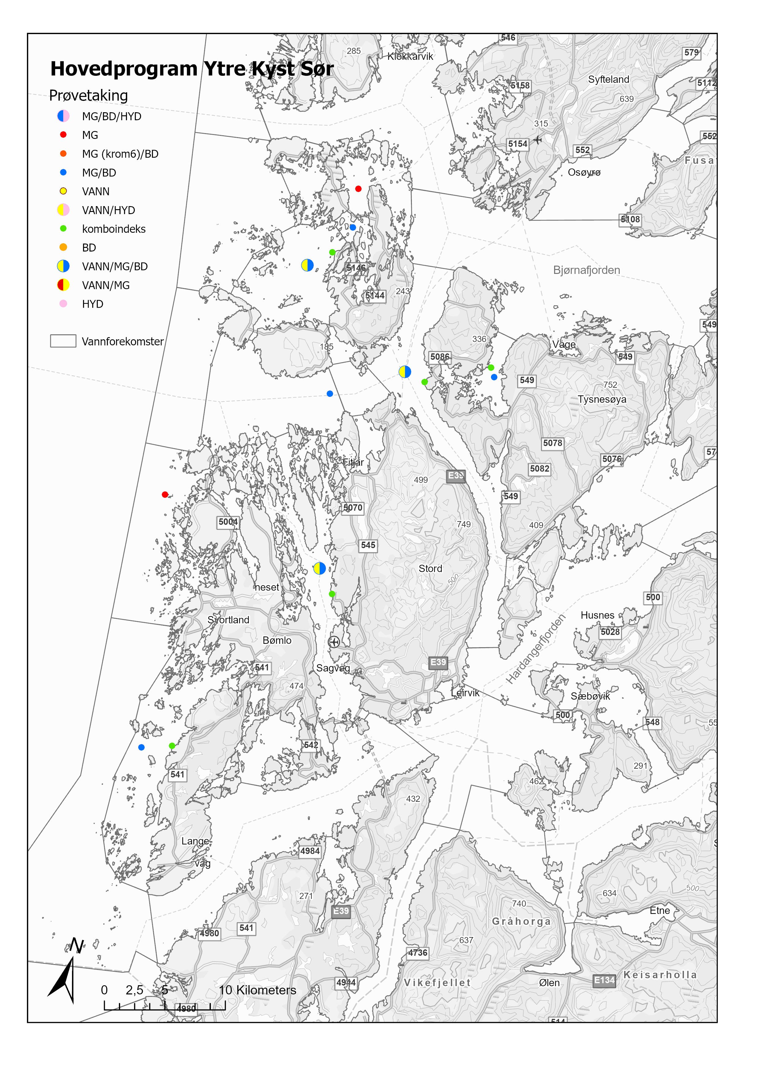 I desse programma skal vi i tillegg til å ta vassprøver av næringssalter, klorofyll og måle oksygen i botnvatnet, gjere undersøkingar av fjæresone og makroalgar i sjøsone for å sjå etter teikn på eutrofiering (overgjødsling). Vi skal òg ta prøver av sjøbotn for å undersøke belastninga av miljøgifter og om dyra som grev og lever i sediment på botn har gode levevilkår.